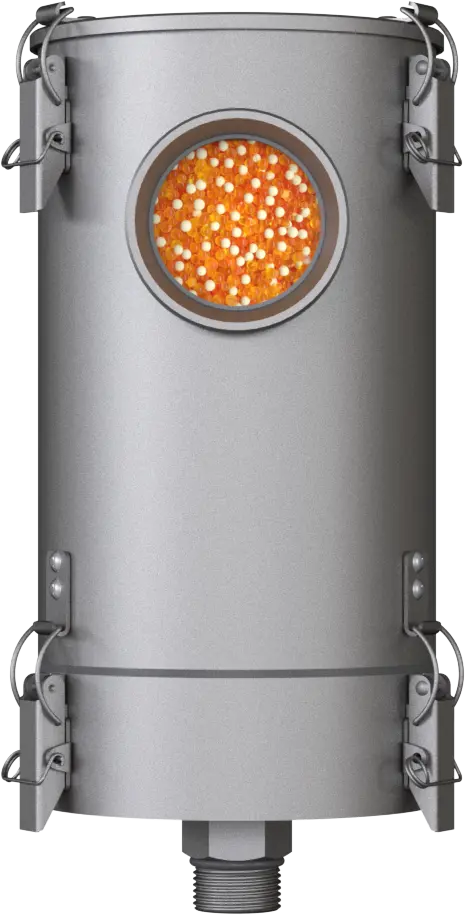Metallic housing (A): Protects the inner workings of the adsorber. The refillable stainless steel housing is suitable for harsh environments, explosion protection zones and offshore use and is highly UV-resistant.